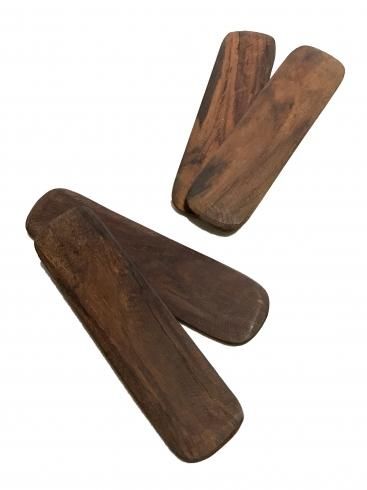 木材一枚の板は親指と人差し指の付け根で固定、もう一枚の板は中指〜小指を動かして音を出します。