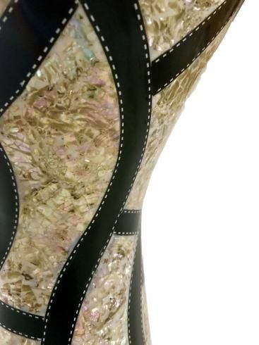 貝殻や木片などを組み合わせてデザインされたモザイク模様が美しく、演奏しない時はインテリアとしても活用出来ます。